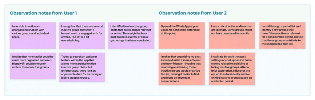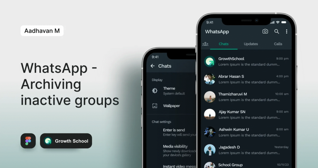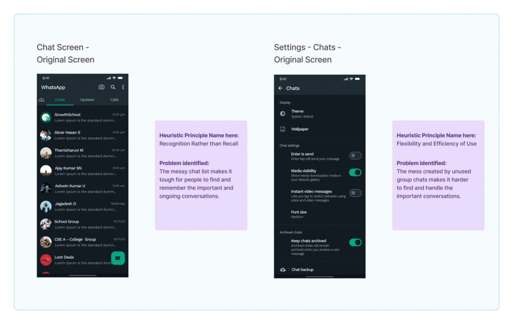 While engaging in the exercises outlined in the “Learning From Existing Design” workbook, I examined different apps, aiming to comprehend their respective designs. Referencing the workbook, I addressed the WhatsApp application, known for its extensive user base. Recognizing the problem of unorganized chat lists due to inactive groups or chats, I adopted this as my problem statement and commenced my work.