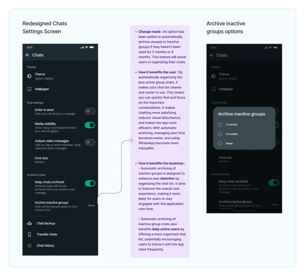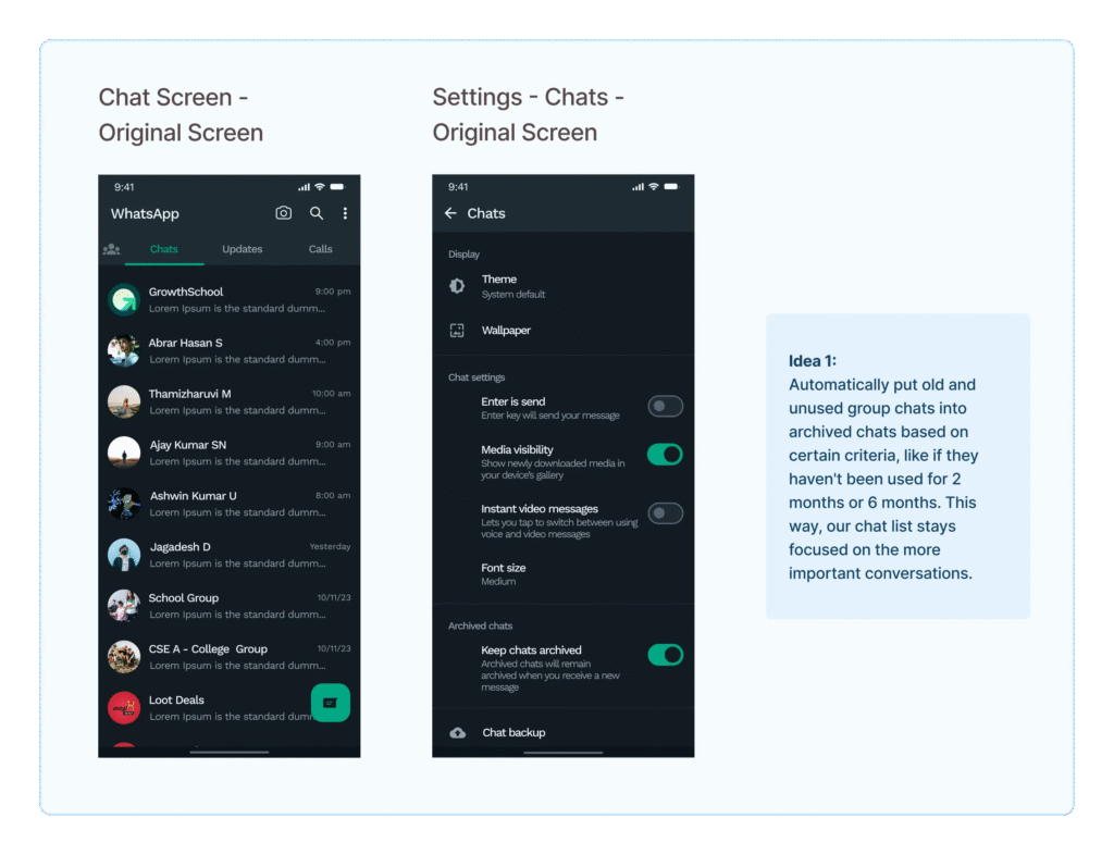 For the previously defined problem, I devised the idea of automatically moving old and unused group chats into archived chats based on specific criteria, such as if they haven’t been used for 2 or 6 months. This approach ensures that our chat list remains focused on more important conversations.